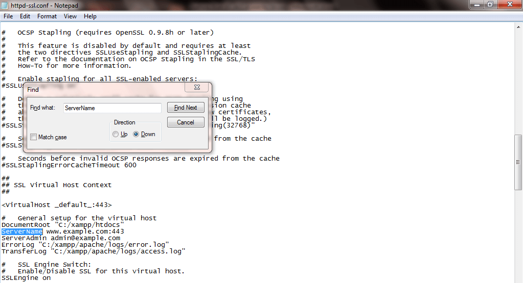 - Also in the same httpd-ssl.conf you can find another line defining the port number. Search for “ServerName”, for instance: