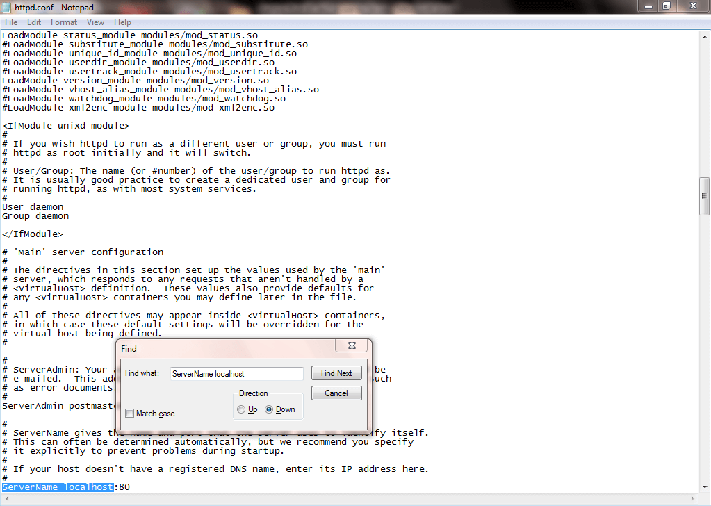 Now, in the same httpd.conf file look for “ServerName localhost:” Set it to the new port number: