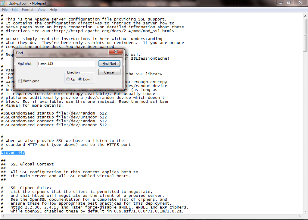 - In the httpd-ssl.conf file, search for “listen” again. You may find: “Listen 443”. Hence, change it to listen on a new port number of your choice. For instance: