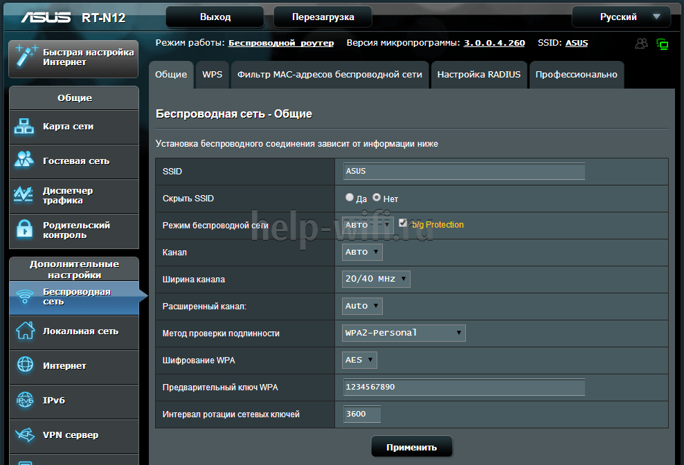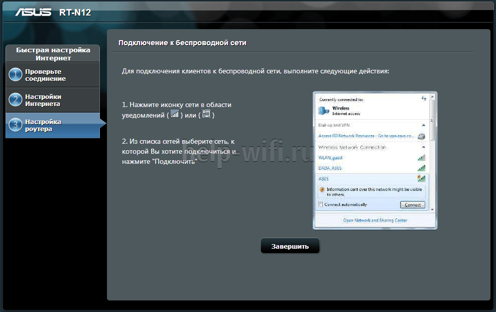 Так как произойдёт переподключение, пользователю станут доступны полные настройки роутера Asus Rt N12. Если же новая сеть не найдена или к ней подключиться не удается, настройку Wi-Fi инструкция рекомендует выполнить отдельно — ручной настройкой.