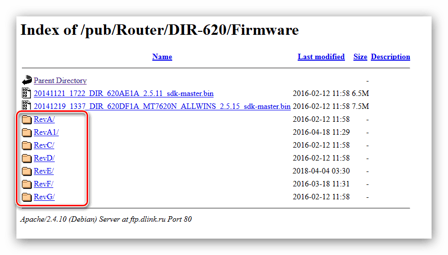 - ftp://ftp.dlink.ru/pub/Router/DIR-620/Firmware/ — Перейдя по этому адресу, открывается структура папок, в каждой из которых содержатся версии для разных ревизий роутера данной модели.