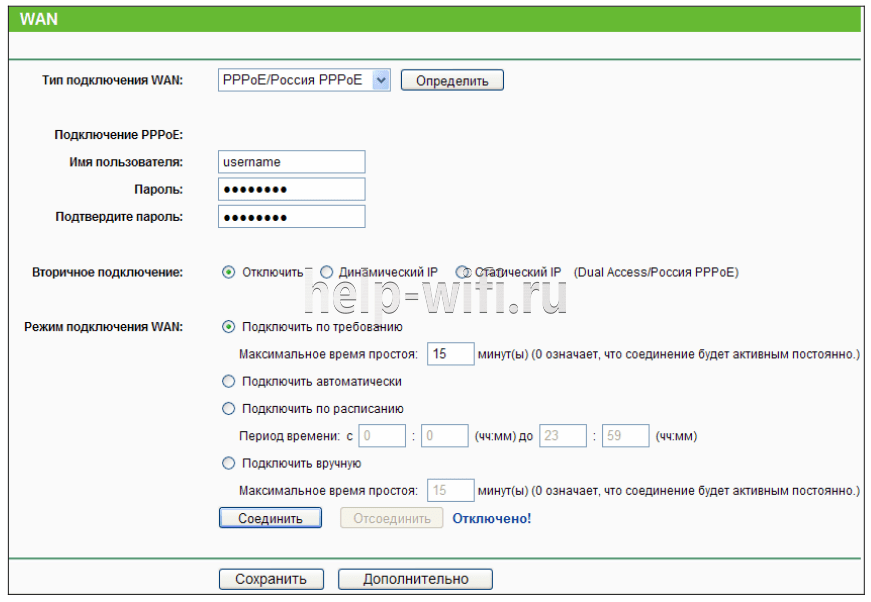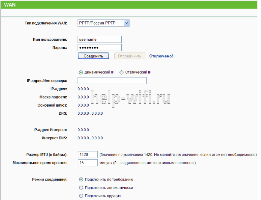 Если поставщик предлагает такое соединение, в выпадающем списке «Тип подключения WAN» ставится значение «PPTP/ Россия PPTP».