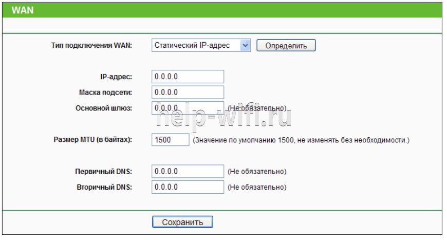 Этот вариант чуть посложнее, потому как все параметры придётся вводить руками. «Тип подключения WAN» — «Статический IP-адрес».