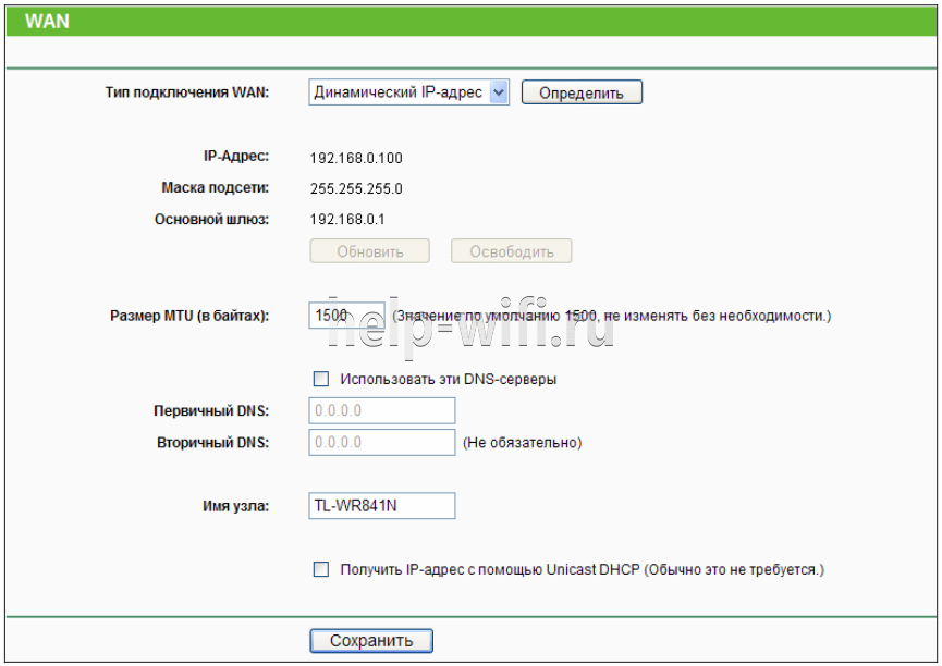 Если доступ к сети интернет провайдер предлагает посредством динамического подключения (когда он выдаёт все необходимое сам), в строке «Тип подключения WAN» выбирается «Динамический IP-адрес» и страница принимает следующий вид: