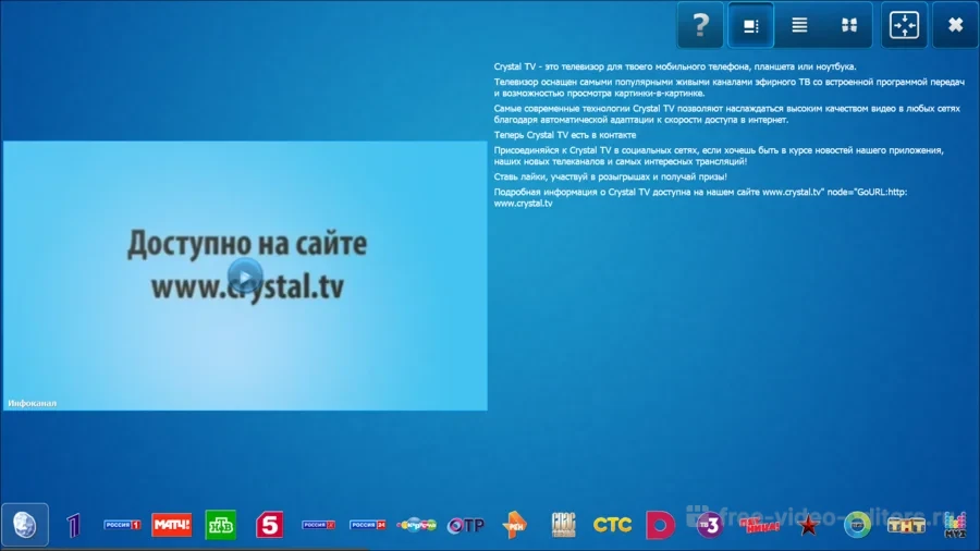 Программа для просмотра телепередач по интернету. Всего в каталоге свыше 50 каналов с вещанием на русском языке. Они доступны бесплатно и без регистрации.