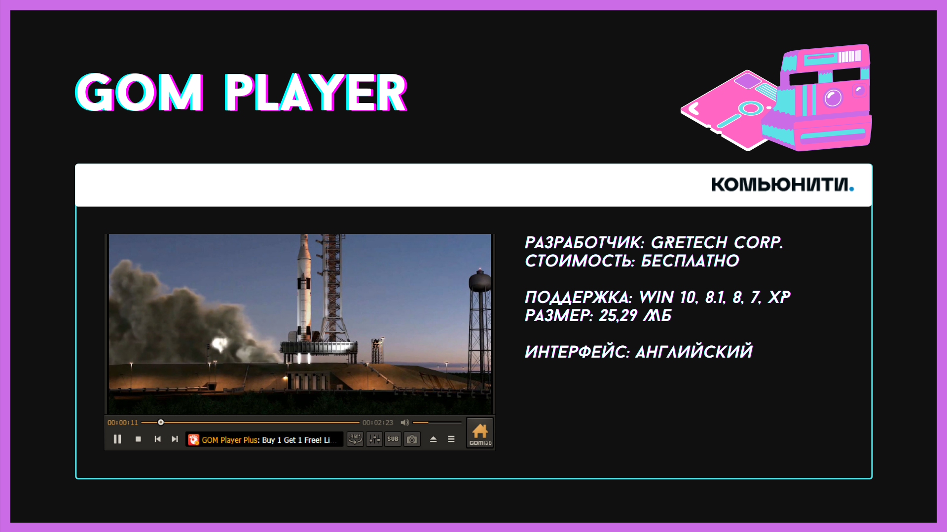 GOM ― стильный видеопроигрыватель для Windows 10 и более ранних версий операционной системы. У него есть все базовые функции, которыми пользуются чаще всего: снимок кадра, покадровая перемотка, включение субтитров. Если звук в видеофайле не устраивает, здесь можно отрегулировать громкость, поиграть с бегунками эквалайзера или применить эффекты (эхо, 3D и другие).