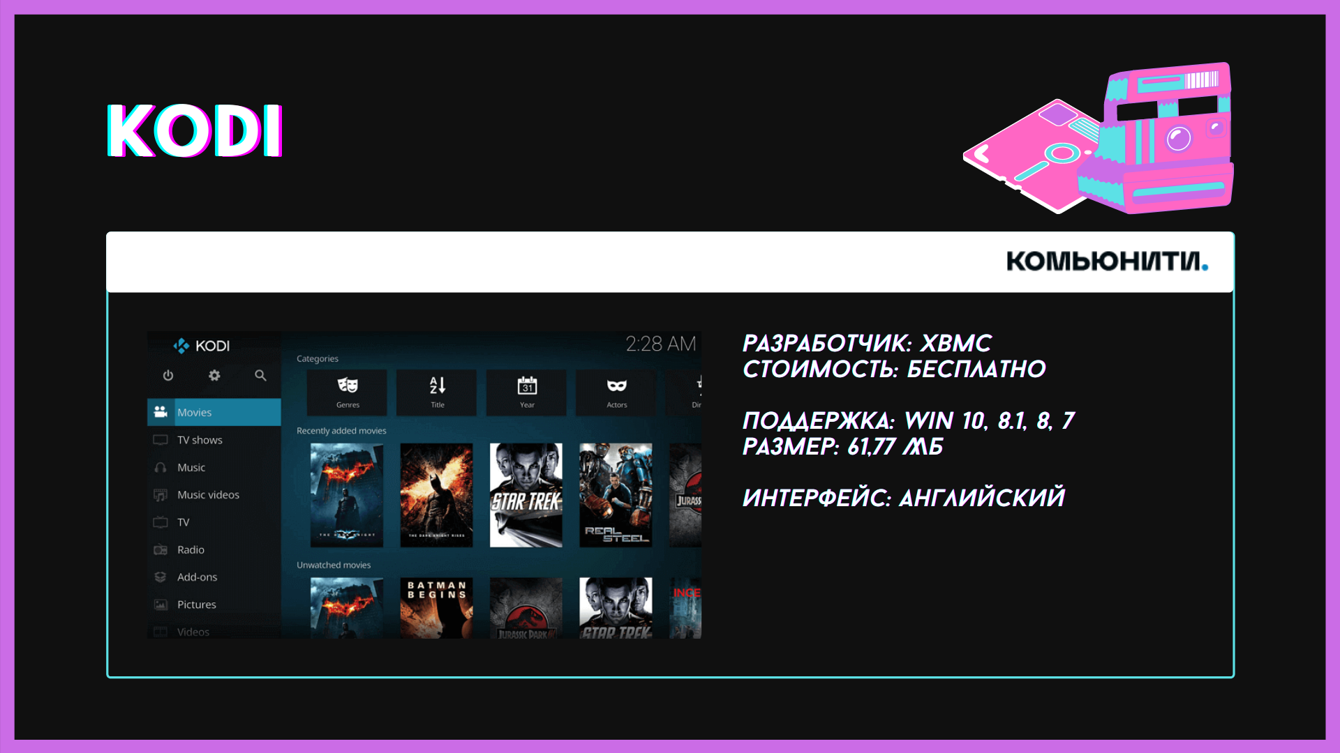 Kodi – это многофункциональная платформа для просмотра телепередач, стриминга и воспроизведения видеороликов. ПО поддерживает практически все существующие ОС. После скачивания вы сможете смотреть ролики из интернета или просматривать файлы, сохраненные локально.
