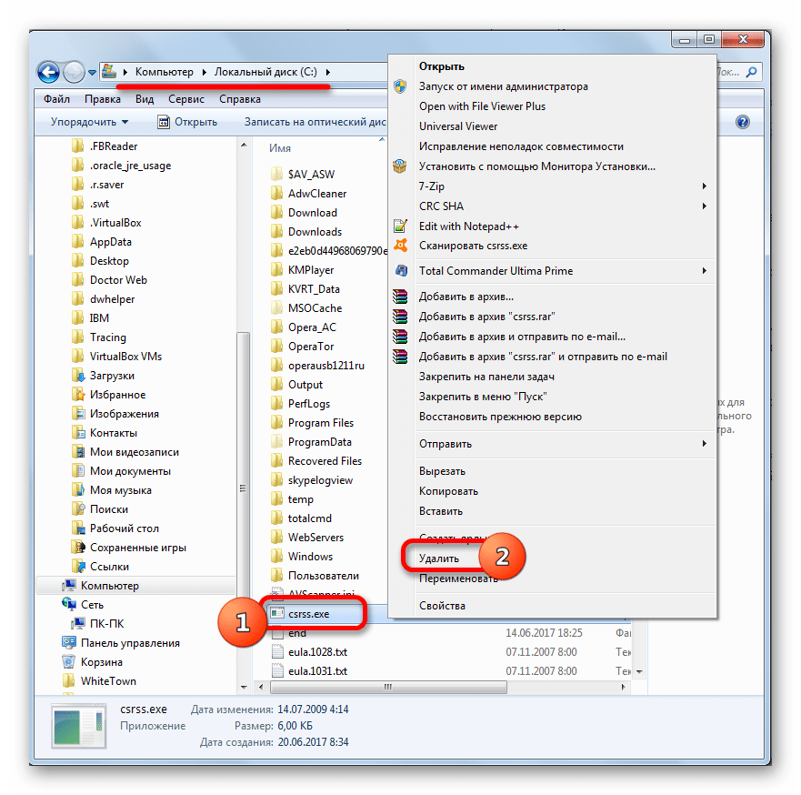 В результате откроется папка, в которой находится файл «csrss.exe», если это не «C:WindowsSystem32», то файл можно удалять. Перед удалением можно попробовать остановить вирус, выбрав пункт «Снять задачу» или «Остановить дерево процессов». Если вирус не удаляется, то можно попробовать из безопасного режима или загрузочного диска.