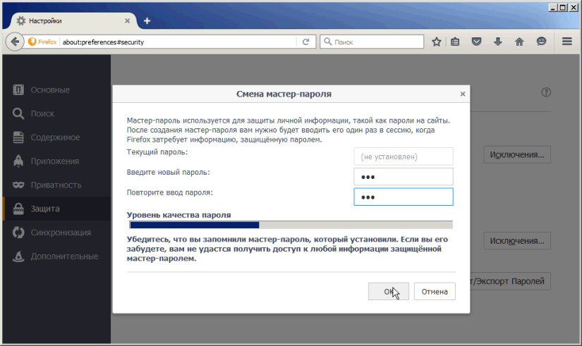 Теперь, чтобы просмотреть пароли, сделать импорт или их экспорт, Firefox затребует с вас мастер-пароль, который вы должны запомнить.