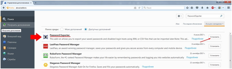 Откройте страничку — https://addons.mozilla.org/ru/firefox/addon/Password-Exporter/