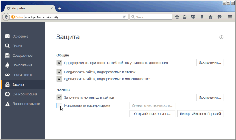 и поставьте галочку возле строки «Использовать мастер – пароль