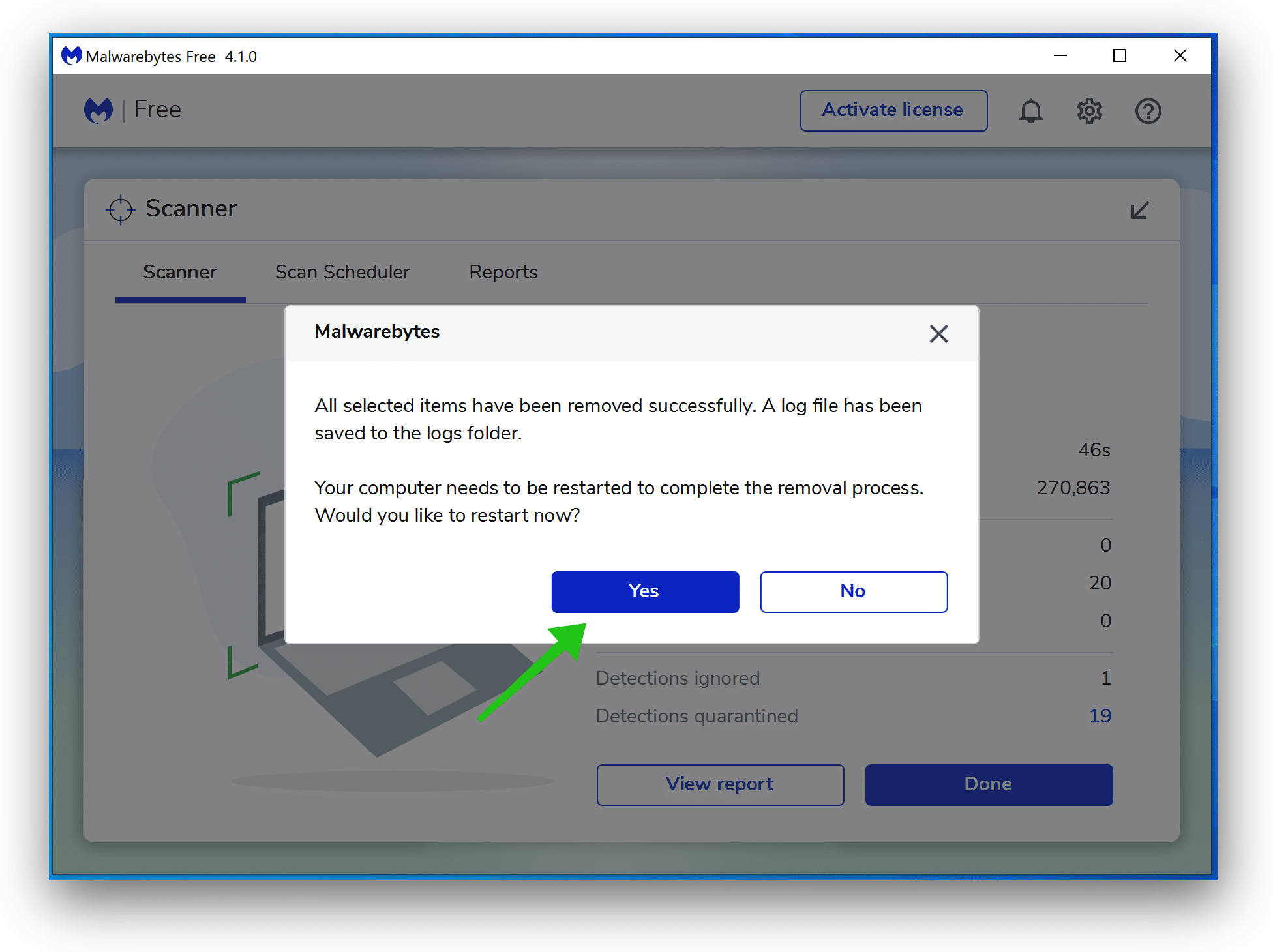 Вредоносное ПО было частично удалено с вашего компьютера. Перезагрузите компьютер для завершения удаления.