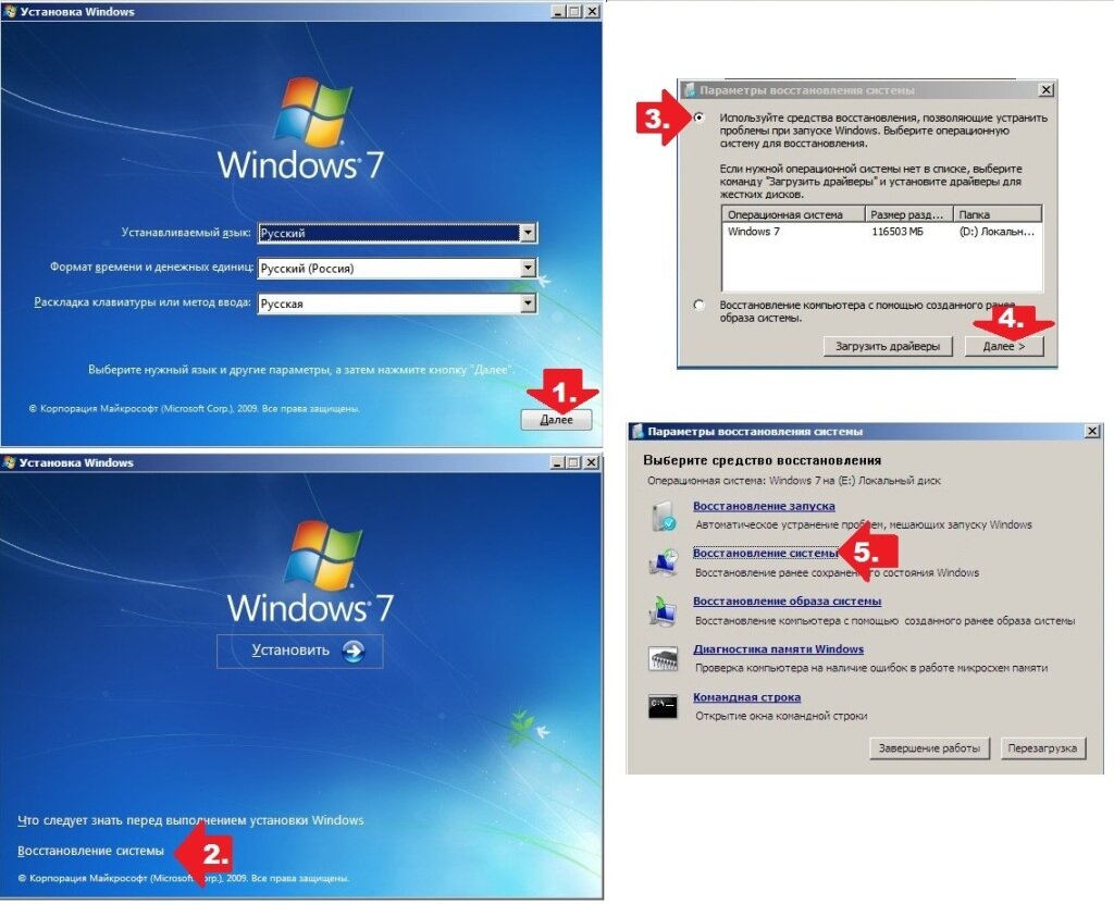 При необходимости также можно выполнить и полное восстановление системы с помощью диска. В этом случае нужно загрузиться с установочного диска с дистрибутивом, нажать в окошке с языковыми параметрами кнопку «Далее», а затем «Восстановление системы». После этого в новом потребуется окошке клацнуть пункт «Используйте средства…», нажать «Далее» и снова «Восстановление системы»: