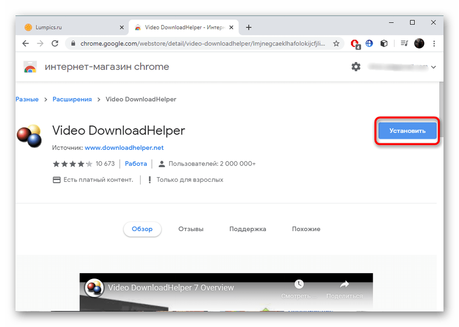 - Откройте страницу Video DownloadHelper в магазине расширений и нажмите на «Установить».
