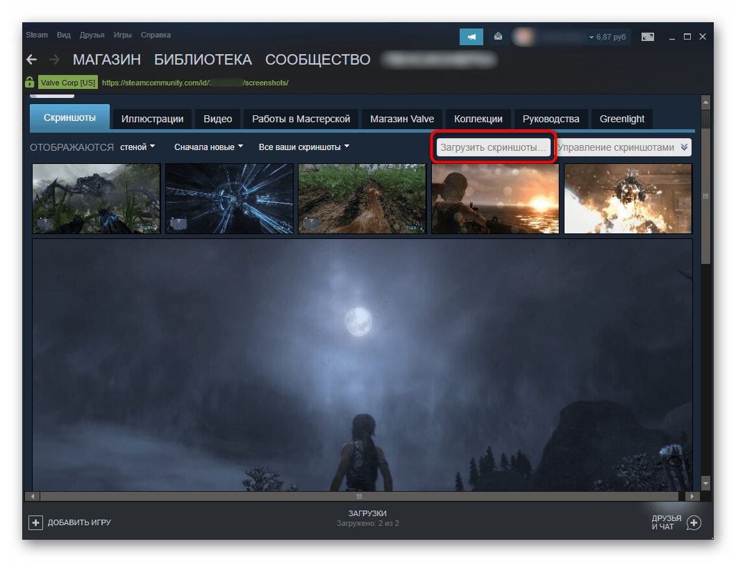- Справа на экране изображена кнопка «Загрузить», она поможет переместить выбранное изображение в Steam Cloud. Это специальное облачное пространство, благодаря которому ваши файлы будут доступны другим пользователям.