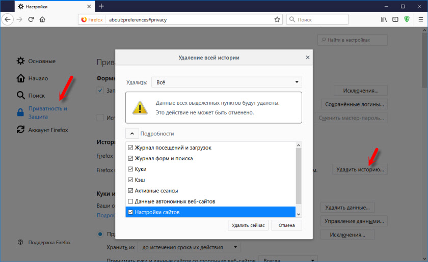- Настройки сайта: В Firefox также хранятся определенные настройки, такие как учет всплывающих окон, характерных для отдельных веб-сайтов. Эти предпочтения также могут быть удалены, если вы этого желаете.