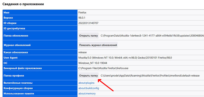 Быстро перейти в профиль можно нажав на кнопку «Открыть папку». Также справа указан полный путь к вашему профилю.