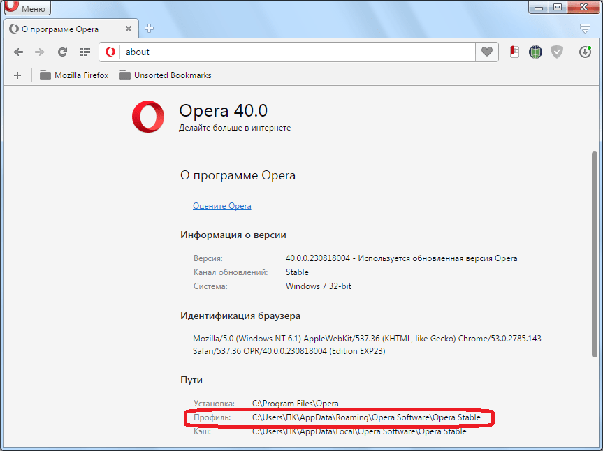 Закладки хранятся в профиле Оперы, поэтому ищем на странице данные, где указан путь к профилю. Этот адрес и будет соответствовать папке профиля для вашего браузера, и операционной системы. Например, для операционной системы Windows 7 путь к папке с профилем, в большинстве случаев, выглядит так: C:Users(имя пользователя)AppDataRoamingOpera SoftwareOpera Stable.