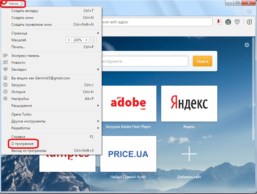 Для того, чтобы узнать, где хранит Опера закладки в каждом конкретном случае, переходим в главное меню браузера. В появившемся списке выбираем пункт «О программе».