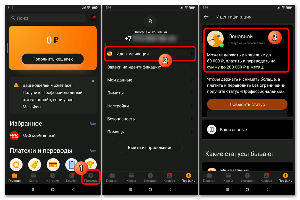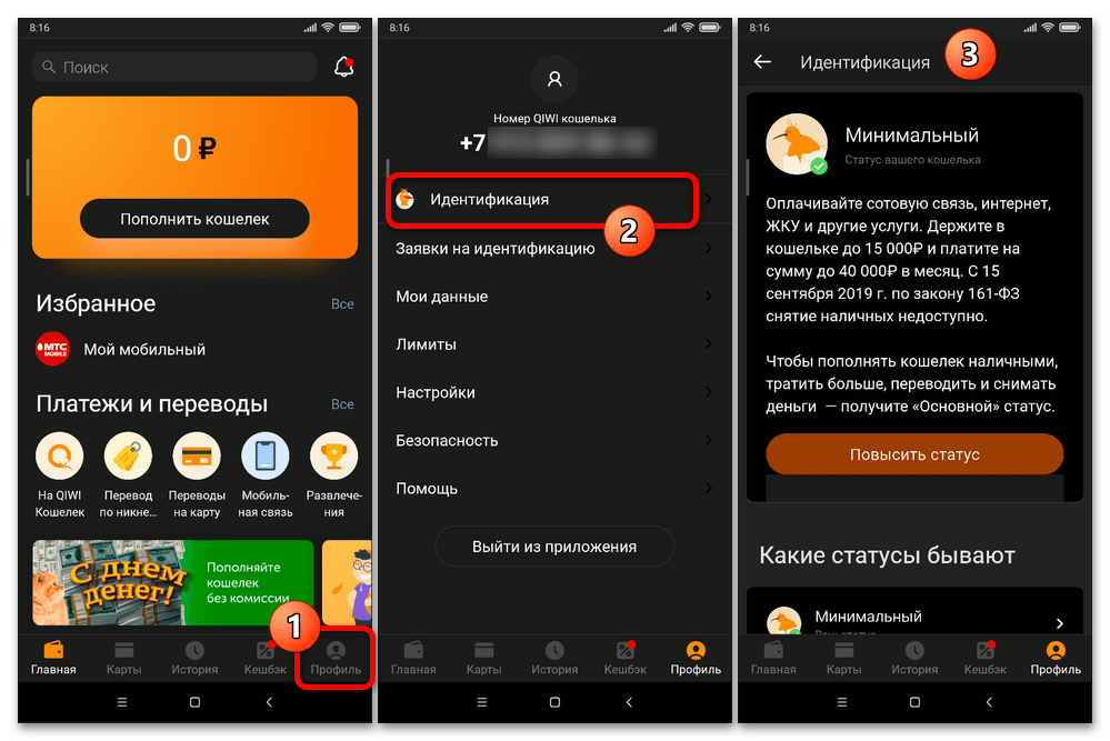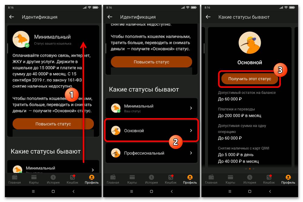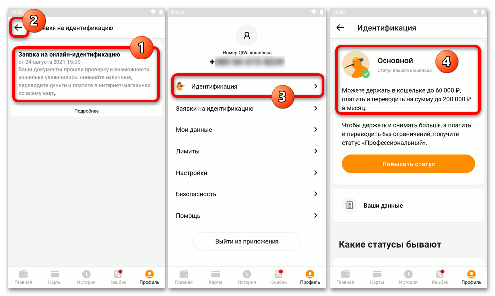 Виды статусов и ограничения идентификаций кошелька Киви.