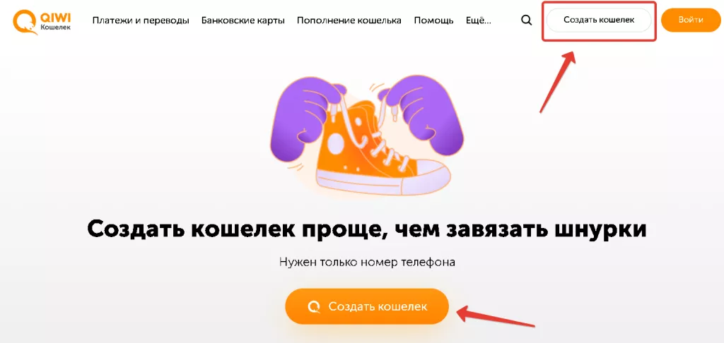 - Войти на сайт платформы qiwi.com и кликнуть на вкладку «Создать кошелек».