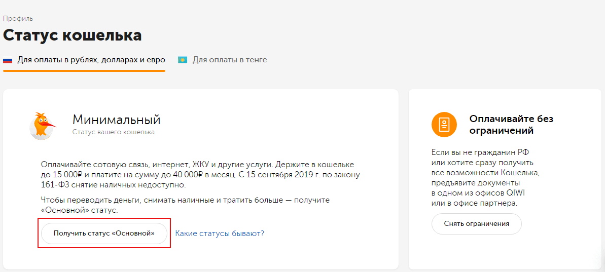 Как убрать ограничение на исходящие платежи QIWI? Необходимо повысить статус кошелька на основной или максимальный.
