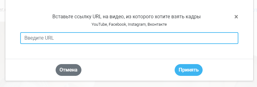 Теперь решим задачу посерьезней: скачать видео с YouTube и обрезать онлайн. Для этого нужно нажать кнопку «Добавить кадры из YouTube, FB, VK», после чего появится окошко с предложением вставить ссылку URL на видео, которое нужно обрезать.