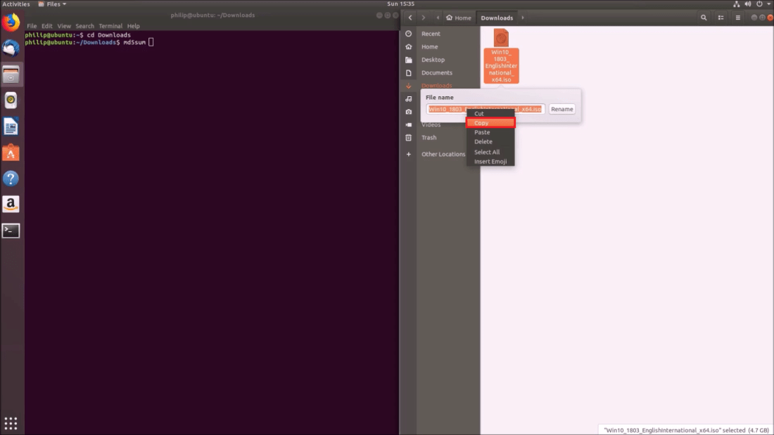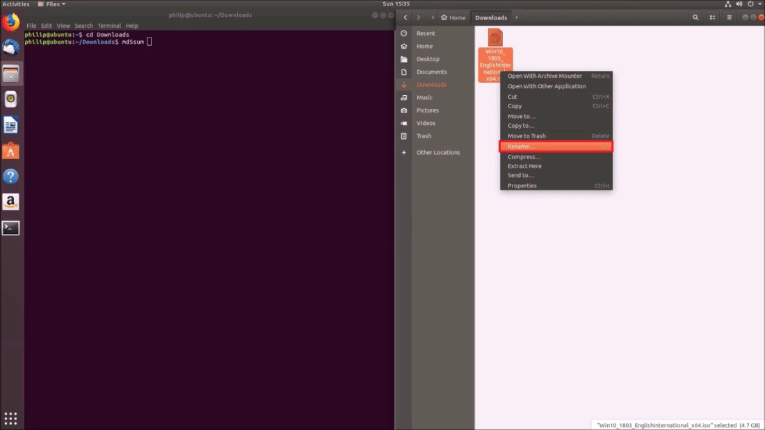 If you have a long .iso filename, it may be better to copy and paste the filename into the terminal. Right click the .iso and then select Rename: