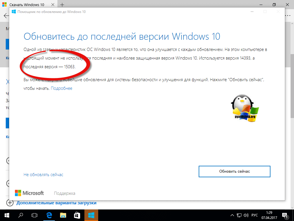 У вас откроется окно мастера, где вам сообщать, какая на текущий момент есть последняя версия, как видите это версия 1703 сборка 15063.0, нажимаем обновить сейчас.