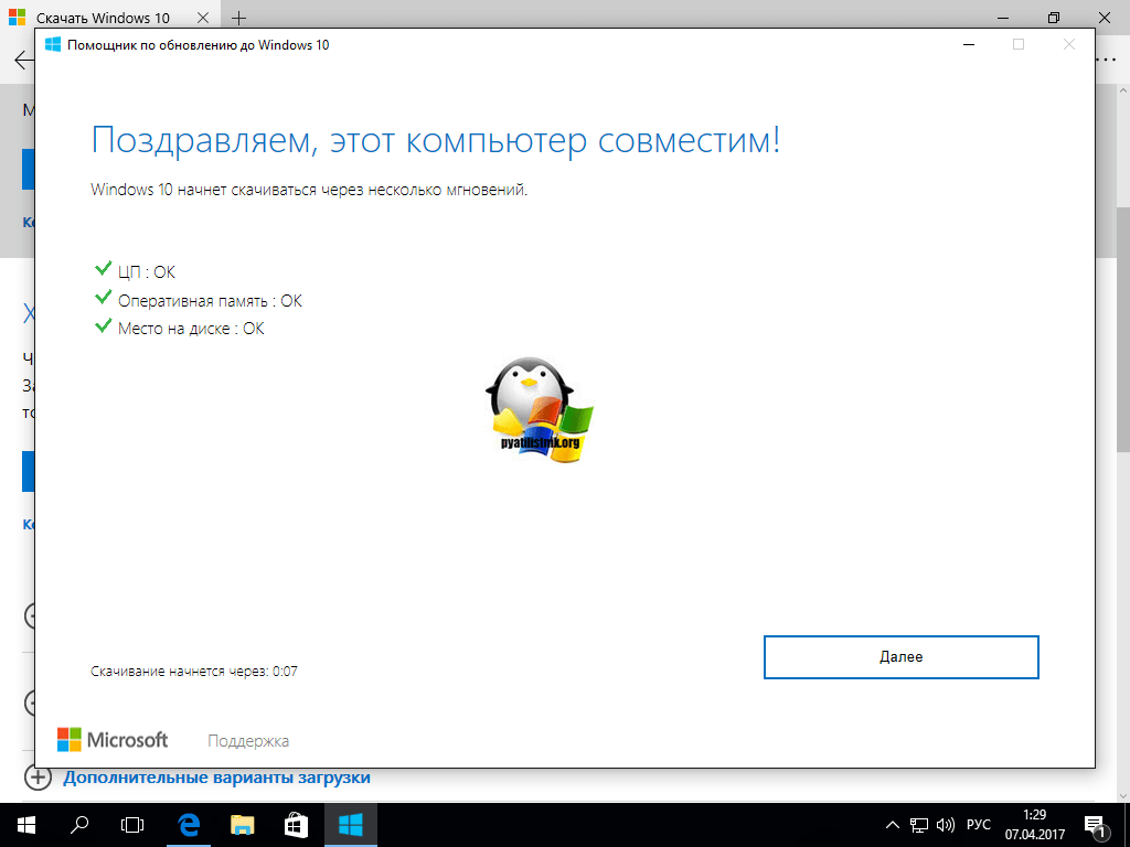 Иногда инструмент обновления сообщает, что конфигурация компьютера не подходит для установки десятки. В таких случаях мы можем запустить инсталляцию с флешки или внутреннего диска. Система установится на компьютер, несмотря на сообщение о несовместимости.