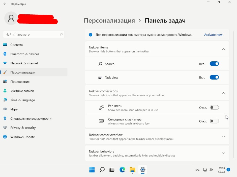 - Taskbar Items – отключает пункты панели задач: поиск, задачи, чат и т.д.
