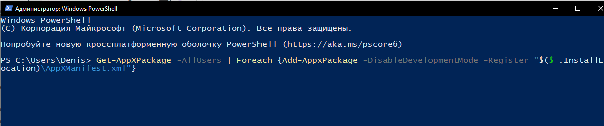 После выполнения команды (каких-либо сообщений появиться не должно, отобразится новое приглашение для ввода следующих команд) закройте PowerShell и перезагрузите компьютер.