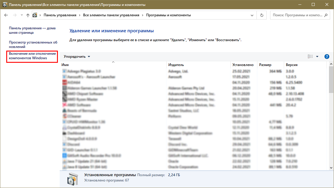 Отключение через «Компоненты Windows»