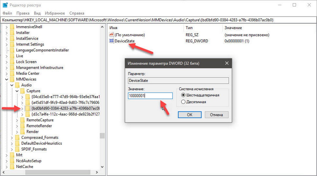 - Справа в разделе {GUID}, связанного с вашим микрофоном, измените или создайте новый параметр DWORD (32 бита) с именем DeviceState.