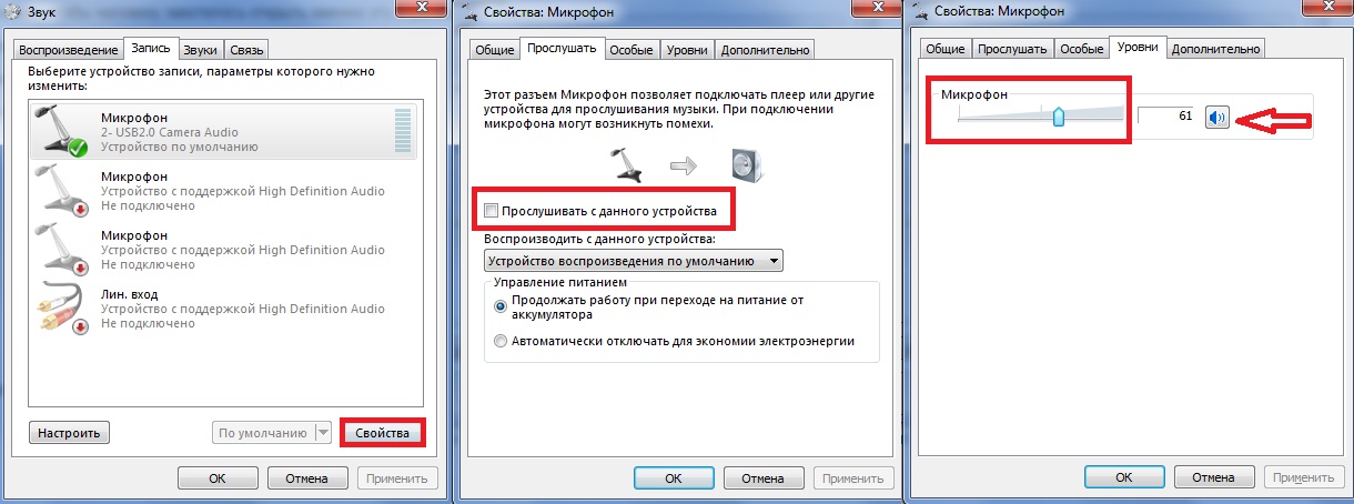 - в свойствах идем во вкладку «Прослушать» и убираем галочку рядом с командой «Прослушивать с данного устройства» – «Применить» – «Ок».