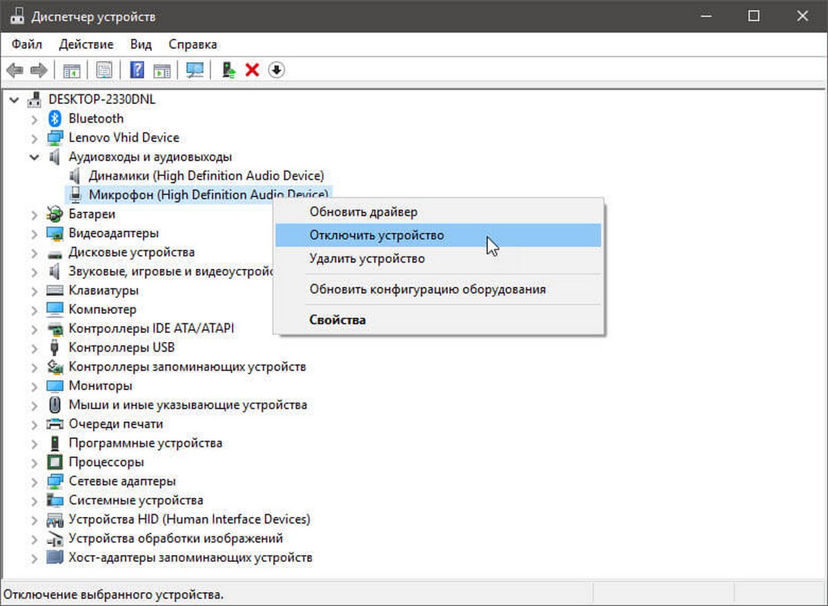 - Кликните правой кнопкой мыши устройство Микрофон и выберите в контекстном меню «Отключить устройство».