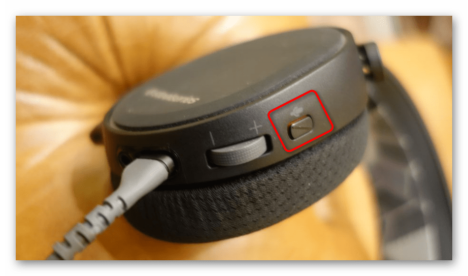 Современные наушники, оснащенные микрофоном, практически всегда имеют выделенную кнопку, которая отвечает за активацию последнего. Ее расположение зависит непосредственно от модели гарнитуры, а на следующем изображении вы видите исключительно пример того, как производитель решил реализовать данную функцию. Нажмите эту кнопку, чтобы отключить или активировать микрофон, а в самих наушниках услышите сигнал об успешном выполнении действия, если, конечно, это предусмотрено встроенным программным обеспечением.