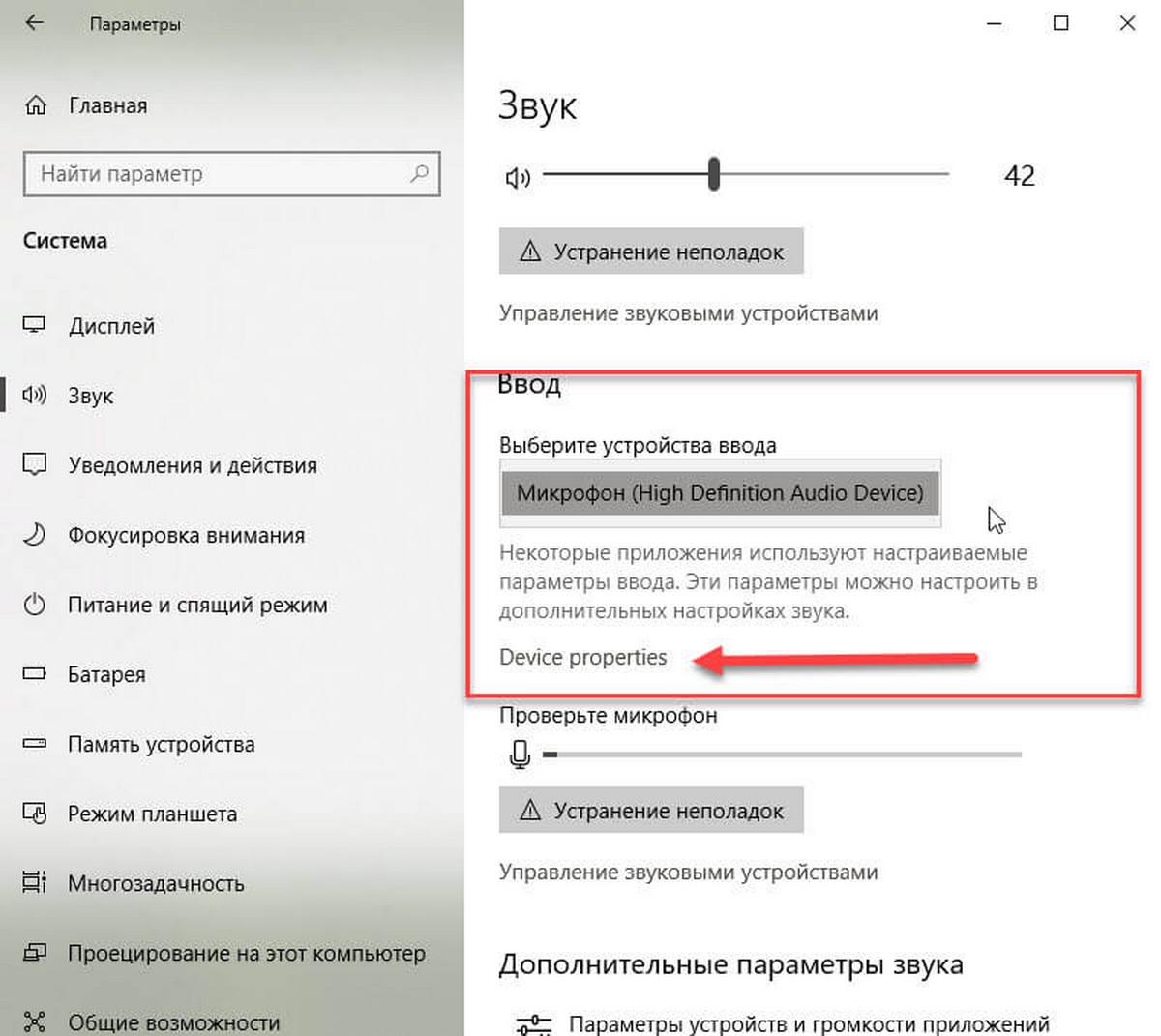 - Зайти в Параметры — Система — Звук (или нажать по значку динамика в области уведомлений правой кнопкой мыши и выбрать пункт «Открыть параметры звука». В разделе «Ввод» выбрать микрофон и нажать «Свойства устройства». Установить отметку «Отключить».