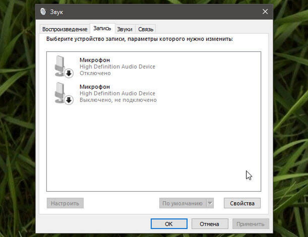- микрофон, который используется, будет отмечен зеленой галочкой – выделяем его (надо просто кликнуть по строке) и нажимаем ставшую активной кнопку «Свойства» чуть ниже;