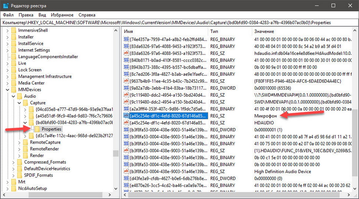 - Откройте раздел «Properties» каждого раздела {GUID}, который у вас есть в папке «Capture», пока не найдете ваше устройство микрофона.