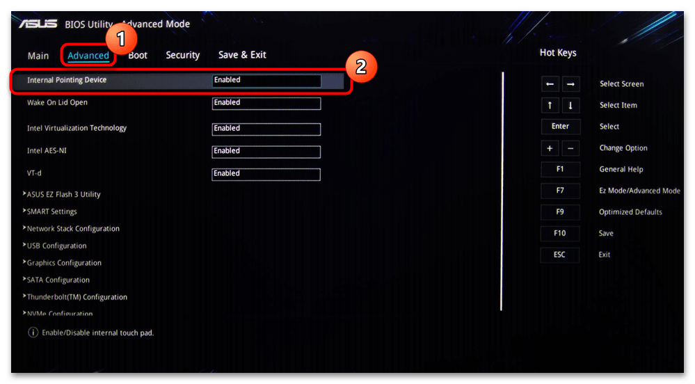 Определенная часть ноутбуков ASUS позволяет отключать сенсорную панель через BIOS, благодаря чему та не будет работать даже при нажатии горячей клавиши. Это распространяется не только на операционную систему — вне ее (например, при установке второй или в среде восстановления) тачпад тоже окажется неактивен. При отключении устройства таким радикальным образом следует это запомнить, чтобы потом не показалось, что оно сломалось. Если вы вообще не пользуетесь тачпадом и не перемещаете ноутбук с одной точки, его полное отключение вполне актуально, хоть и доступно не для каждой модели.