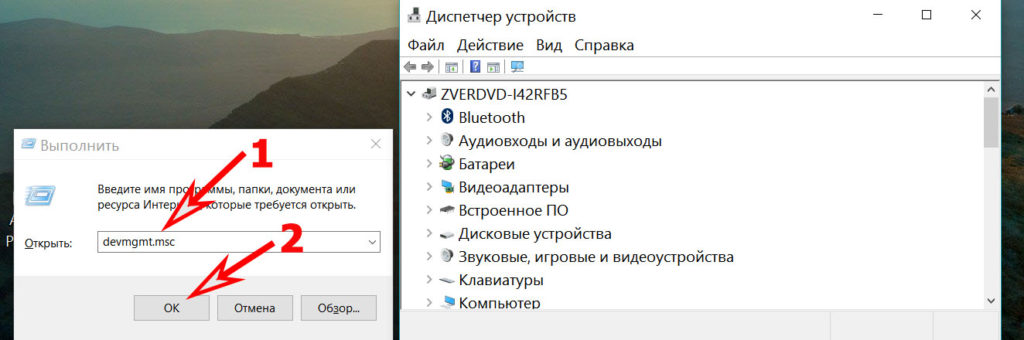 Зажимаем«Win и R». Вставляем эту строчку — «devmgmt.msc». Жмем «ОК». Попадаем в «Диспетчер устройств».