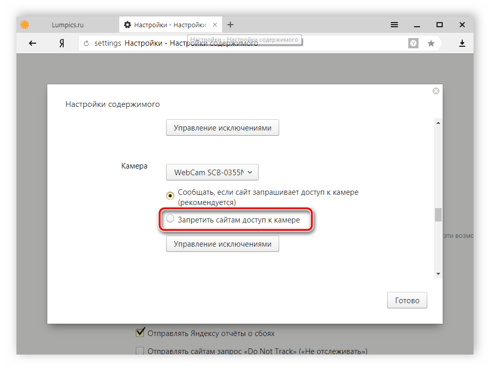 Еще одним популярным веб-обозревателем является Яндекс.Браузер. Он позволяет редактировать многие параметры, чтобы сделать работу более комфортной. Среди всех настроек есть и конфигурация доступа к камере. Отключается она следующим образом:
