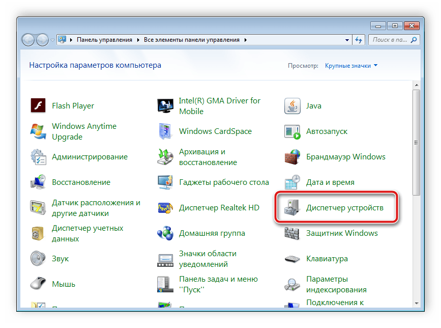 Найдите значок «Диспетчер устройств» и нажмите на него левой кнопкой мыши.