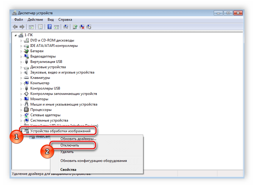 В списке оборудования разверните раздел с «Устройства обработки изображений», кликните на камеру правой кнопкой мыши и выберите пункт «Отключить».