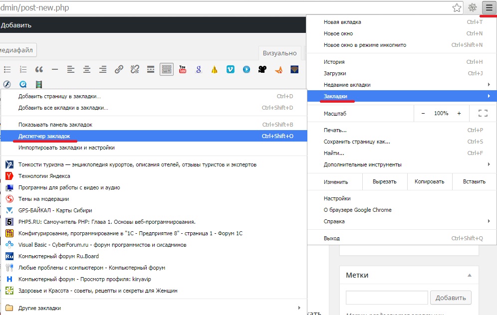 Первым делом нужно открыть браузер Гугл Хром. Далее нужно отыскать в правом углу окна меню Хрома. Просто поднимите глаза вверх окошка, там Вы увидите 3 горизонтальные полоски. Это и есть меню, которое нам нужно. Потом ищем в вылетевшем списке собственно «Закладки», в которых находим Диспетчер.