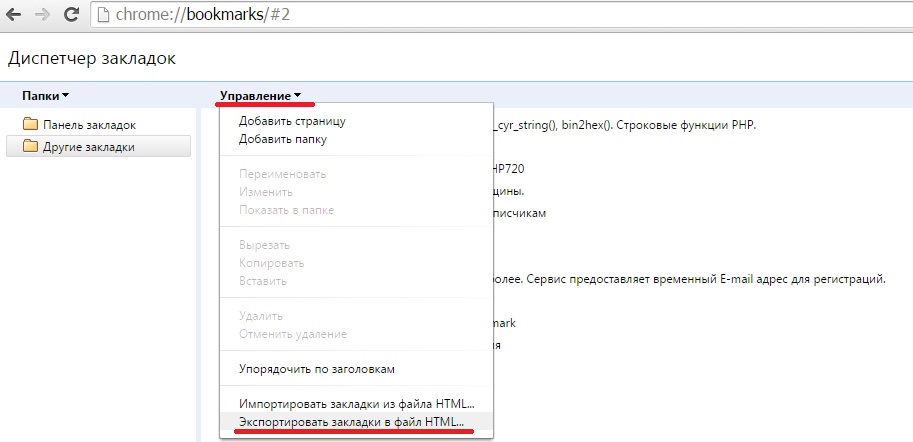 Нажимаем «Управление» и выбираем пункт «Экспортировать закладки в файл HTML». Хром предлагает перенести Ваши любимые закладки в HTML.