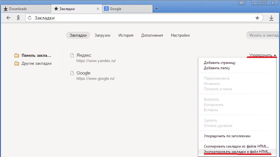 - В открывшемся диспетчере закладок щелкните по пункту «Управление» или «Упорядочить» (в Яндекс.Браузере) и в выпадающем списке выберите «Экспортировать закладки в файл HTML» либо «Импортировать закладки из файла HTML», в зависимости от того, что нужно сделать.