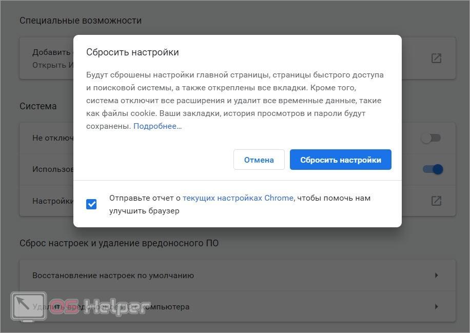 Если выполненные действия с помощью сторонних программ не привели к положительному результату, то попробуйте сбросить настройки вашего браузера. Рассмотрим данную процедуру на примере популярного Google Chrome: