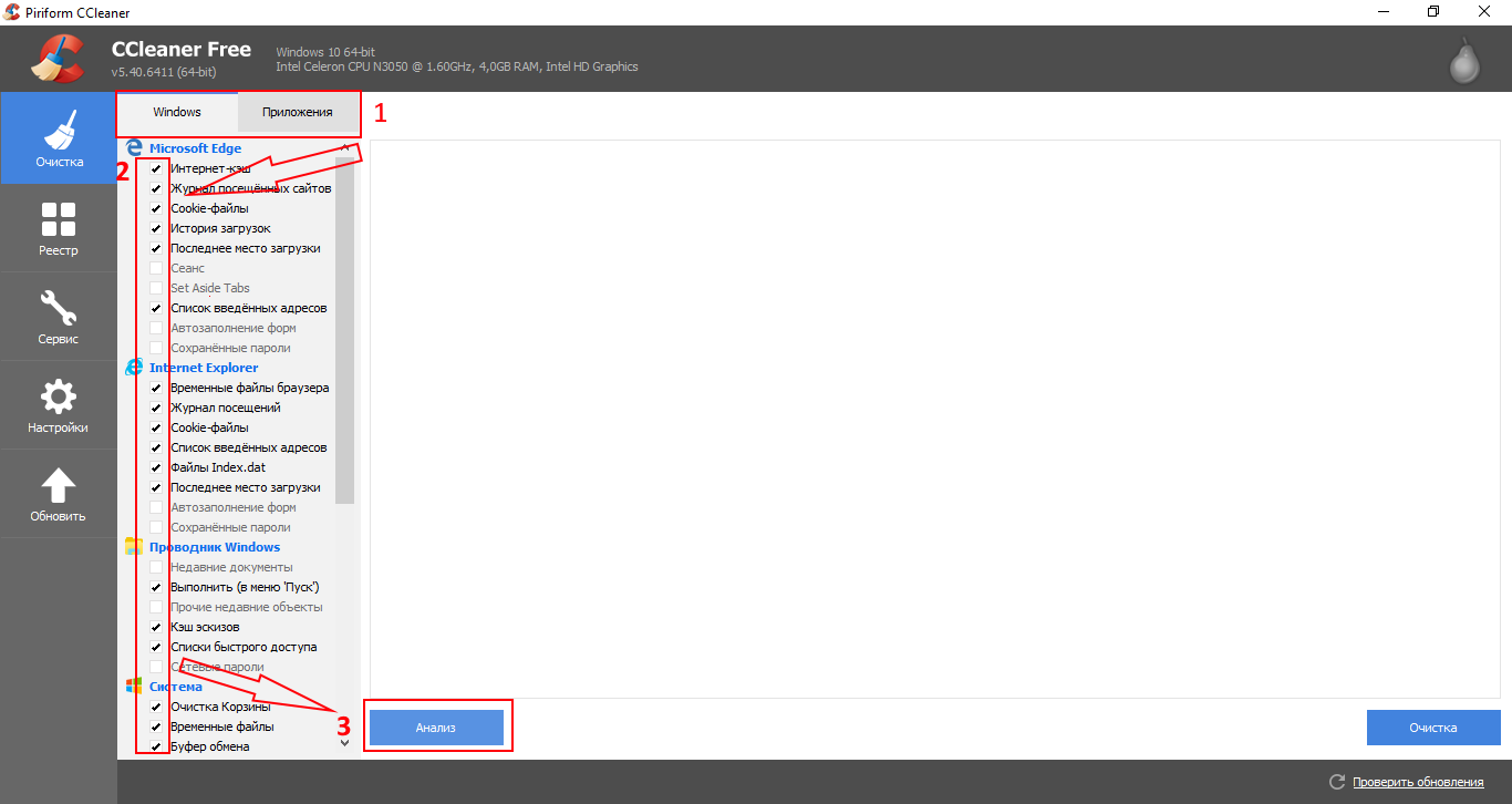 Кликните на вкладку под названием «Очистка», и вам откроется довольно большое меню с возможностью отмечать галочками необходимые для очищения пункты. Помимо этого, во вкладке Очистка присутствуют ещё две подвкладки — это «Windows» и «Приложения». В первой подвкладке расположены стандартные параметры очистки, уже изначально отмеченные таким образом, чтобы произвести качественное удаление ненужных файлов и мусора, подходящее для большинства пользователей и даже для тех людей, кто плохо умеет обращаться с ПК и компьютерными программами.